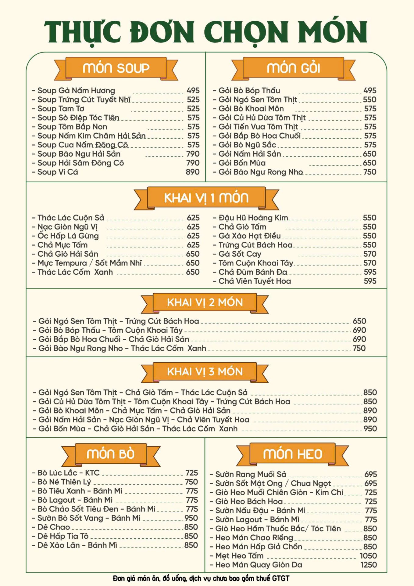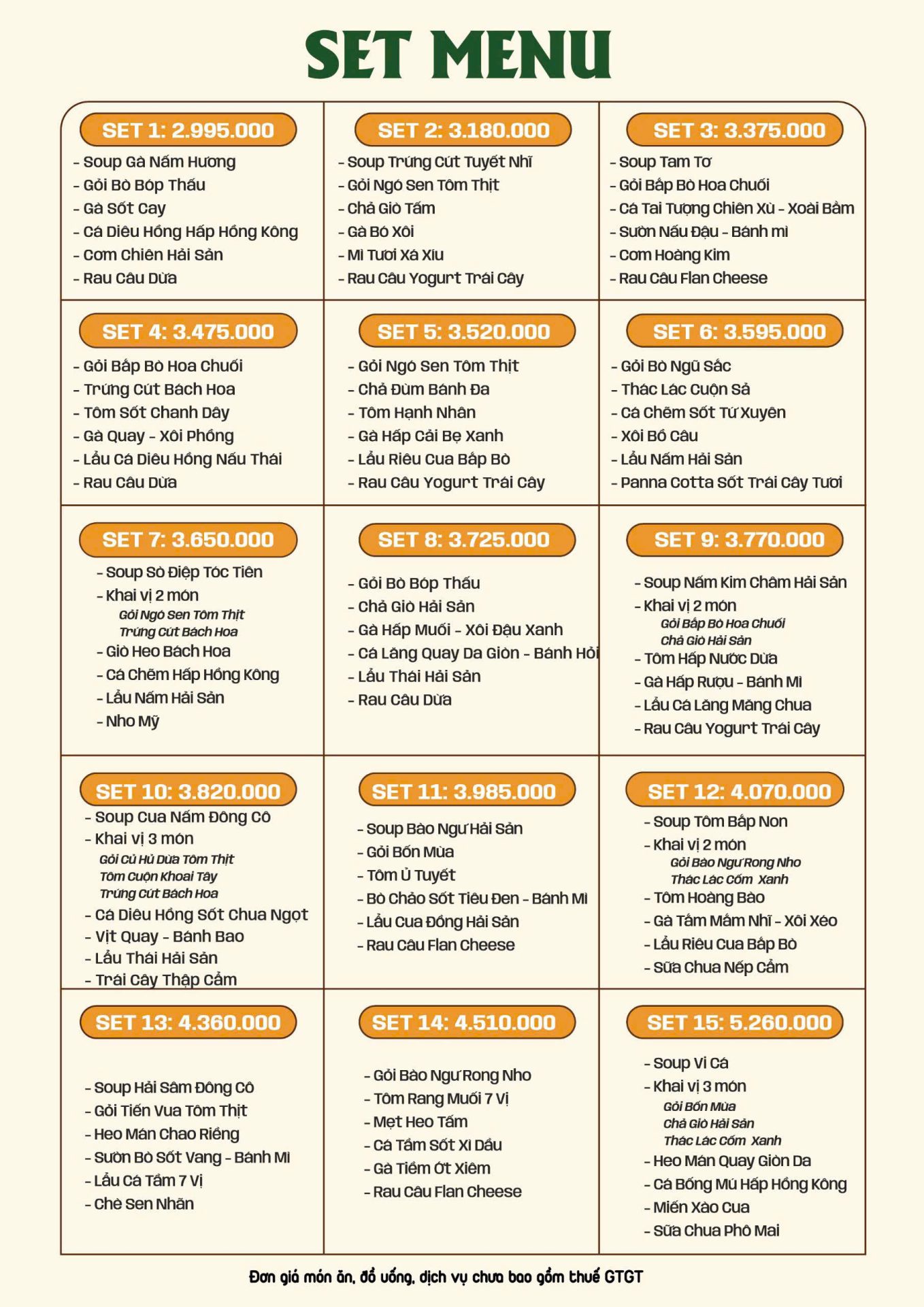 Set menu chỉ bao gồm thức ăn, chưa bao gồm bia và nước uống.