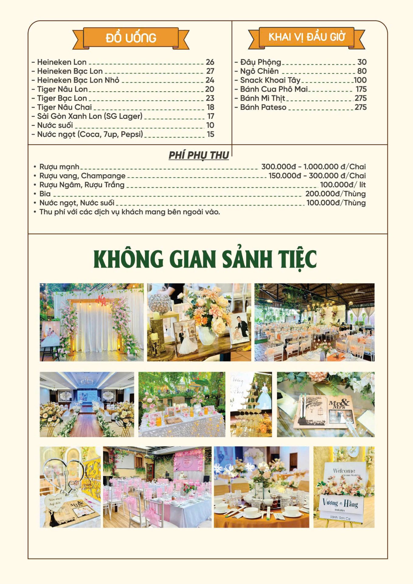 Thực đơn tiệc cưới với 6 món đầy đặn chỉ 2,995 triệu, được thiết kế dựa trên kinh nghiệm tổ chức tiệc báo hỷ, tiệc cưới hơn 20 năm của nhà hàng Vườn Quê.
