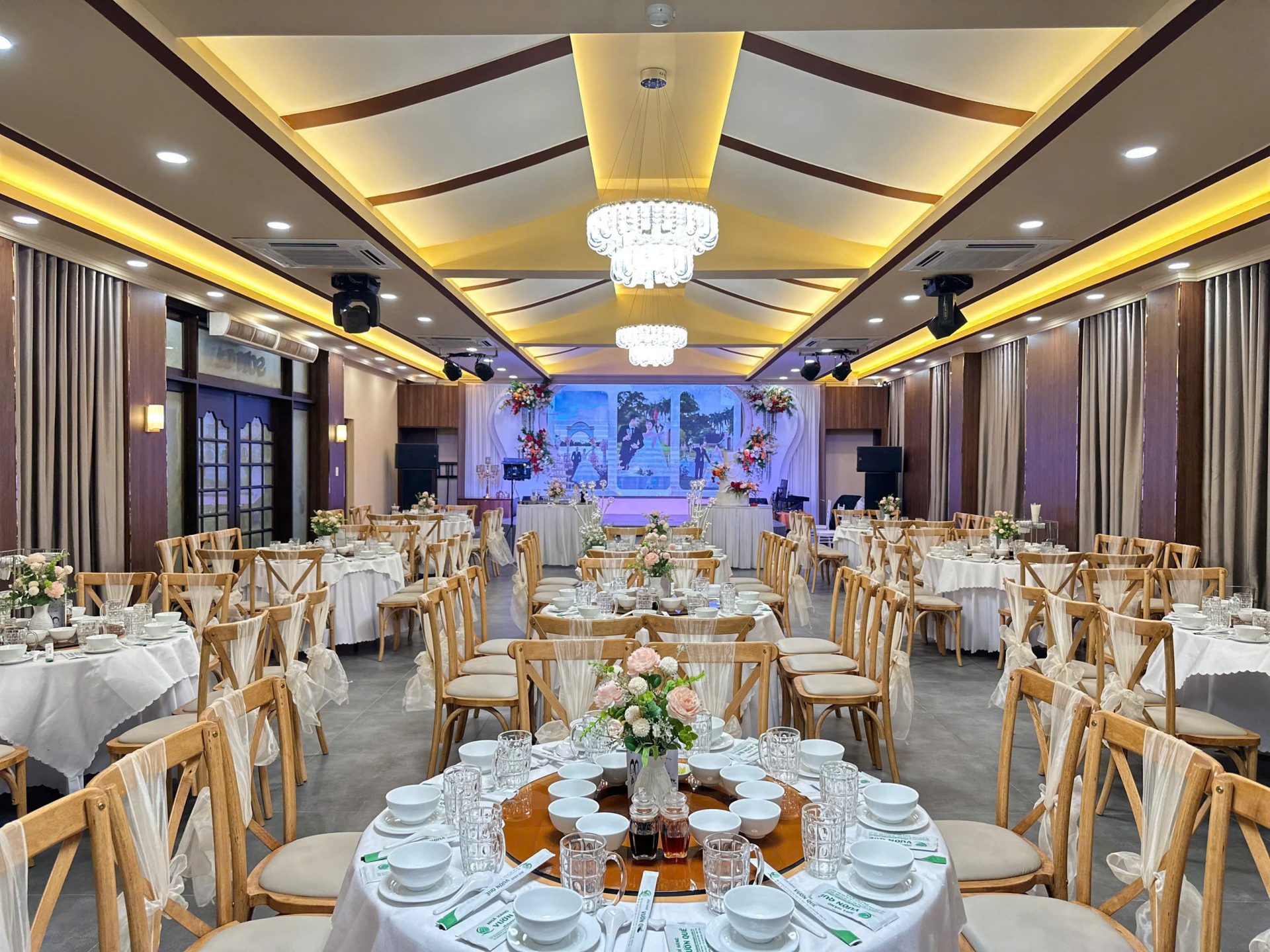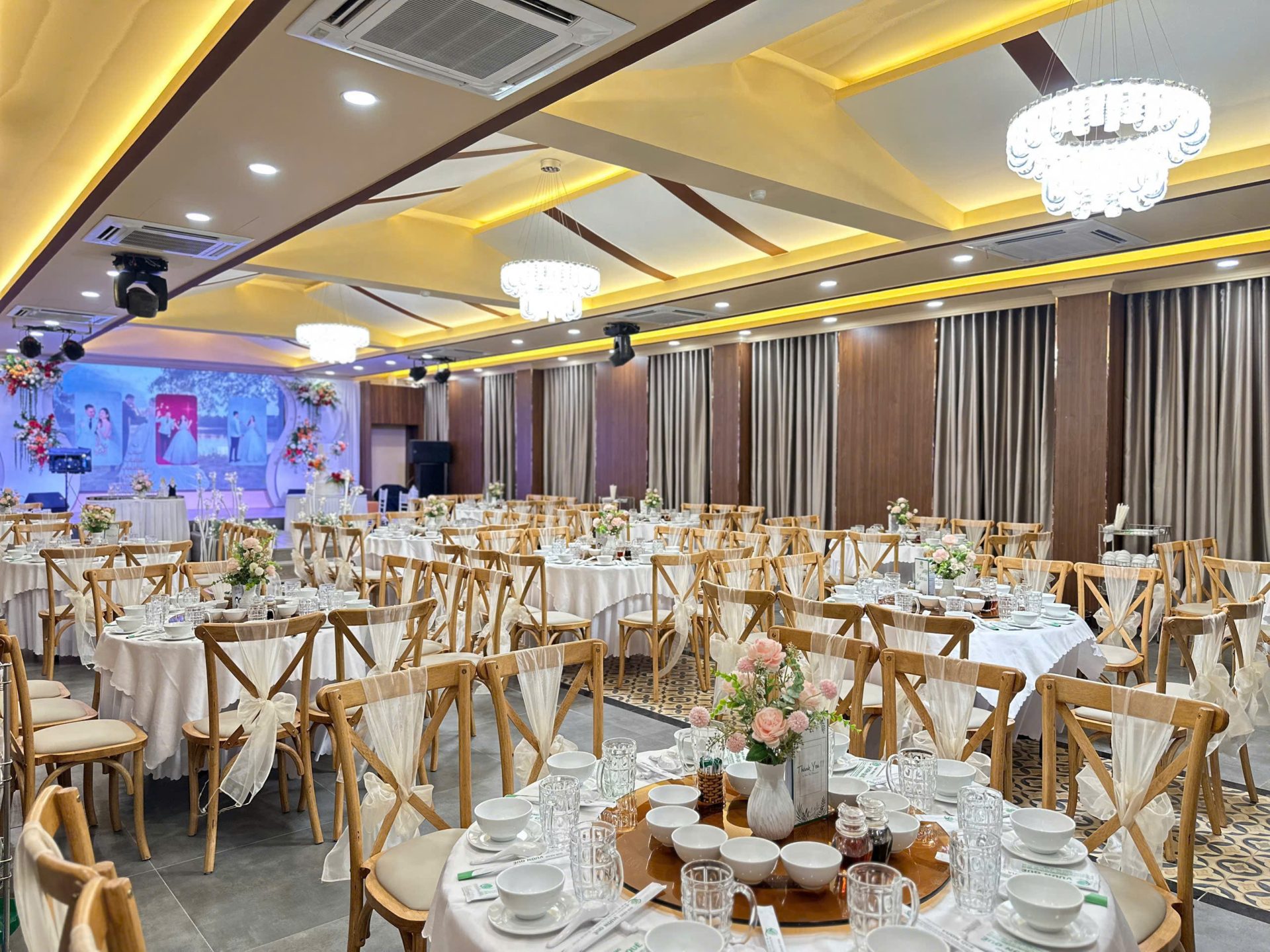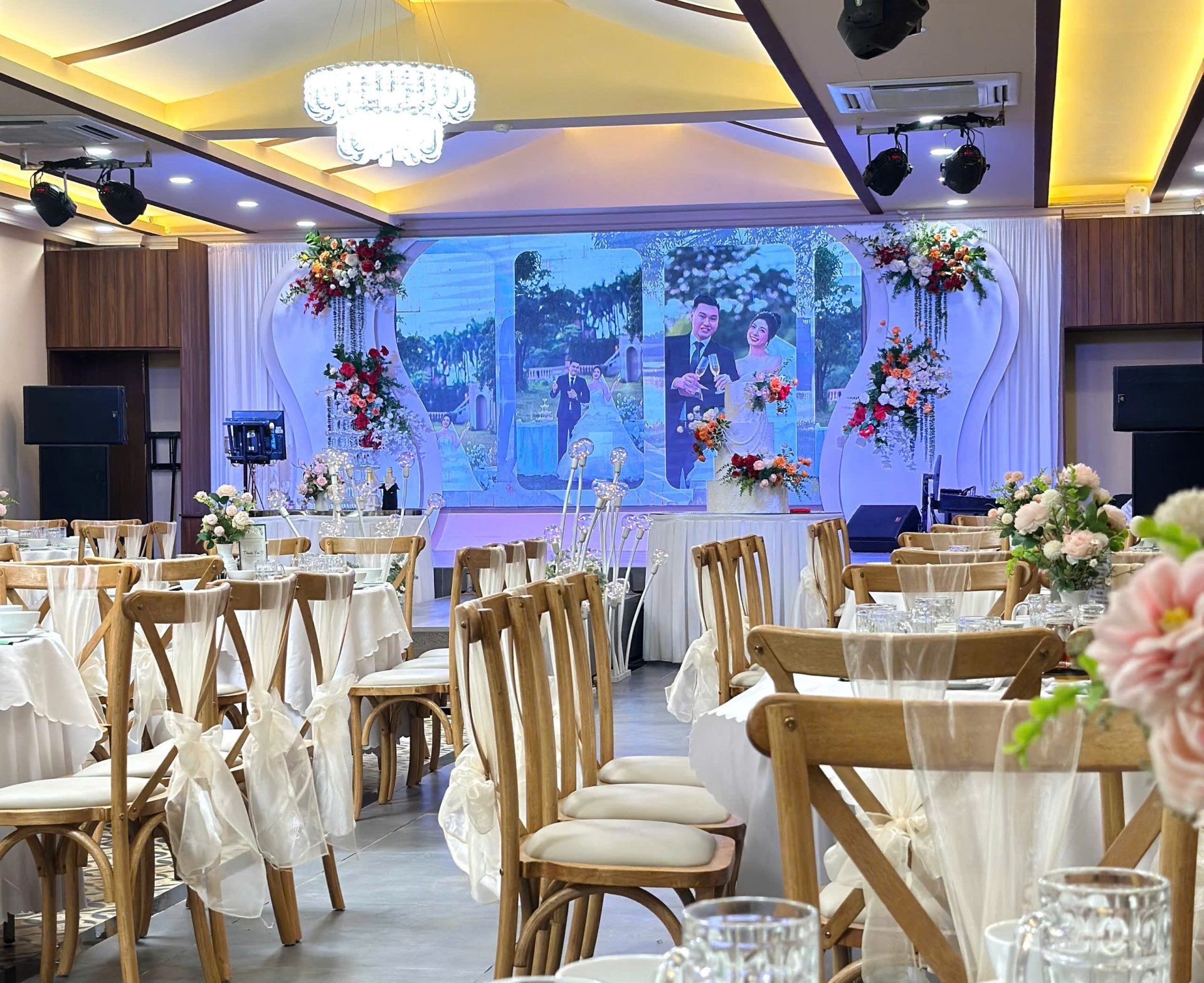 Gói trang trí sân khấu, backdrop chụp hình nhà hàng đã mặc định theo từng sảnh. Quý khách có thể chọn và thay đổi màu nơ ghế theo tình hình thực tế nhà hàng.