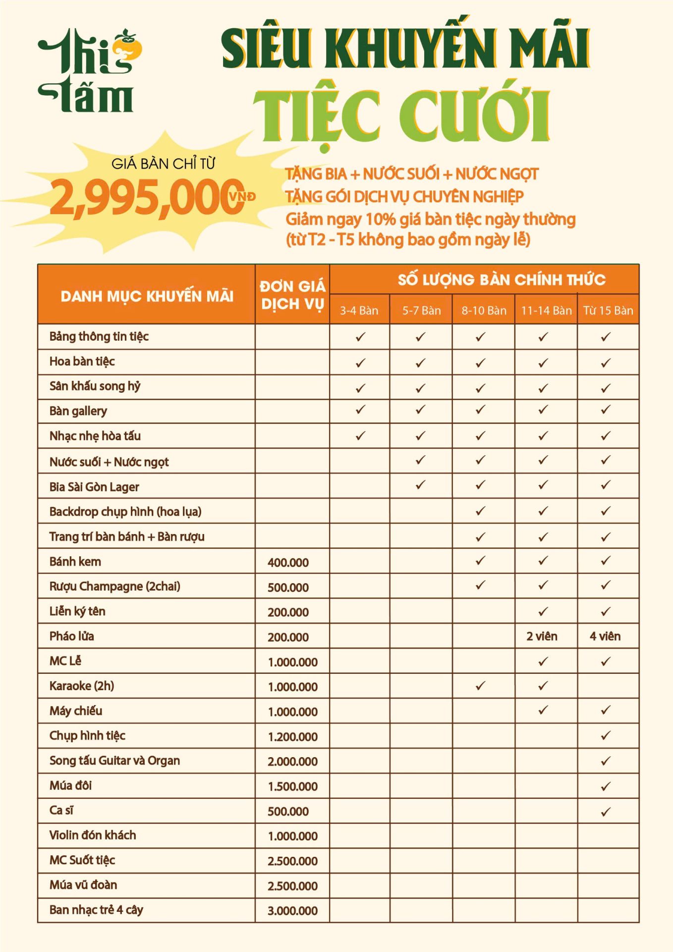 Nhận được tổng các ưu đãi dịch vụ hấp dẫn, trị giá đến 20+ triệu, khi đặt từ 15 bàn tiệc, tặng thêm: